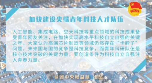 人工智能、集成電路、空天科技等重點(diǎn)領(lǐng)域的科技成果備受青年網(wǎng)友關(guān)注,在加快實(shí)現(xiàn)高水平科技自立自強(qiáng)的關(guān)鍵之年,大家認(rèn)為高端芯片制造等領(lǐng)域仍然存在“卡脖子”問題。未來國與國的競爭是科技競爭,而青年科研隊(duì)伍是核心技術(shù)突破的關(guān)鍵力量,要?jiǎng)?chuàng)造條件為科技自立自強(qiáng)注入青春力量。