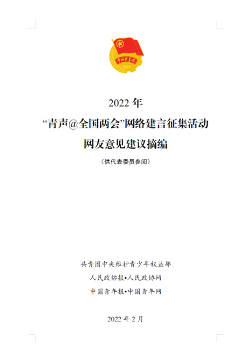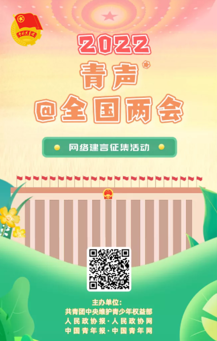 2022年2月11日,團(tuán)中央維護(hù)青少年權(quán)益部聯(lián)合人民政協(xié)報(bào) 人民政協(xié)網(wǎng)、中國青年報(bào) 中國青年網(wǎng)開展2022年“青聲@全國兩會(huì)”網(wǎng)絡(luò)建言征集活動(dòng) ,聽取廣大青少年的意見建議?;顒?dòng)秉承“發(fā)青年之聲、獻(xiàn)青年之智、聚青春之力”的宗旨,充分發(fā)揮共青團(tuán)橋梁紐帶作用,把青年的所思所想所愿有序反映給有關(guān)方面,把青年的真知灼見有效傳遞給黨和政府,為促進(jìn)國家經(jīng)濟(jì)社會(huì)發(fā)展獻(xiàn)計(jì)助力。