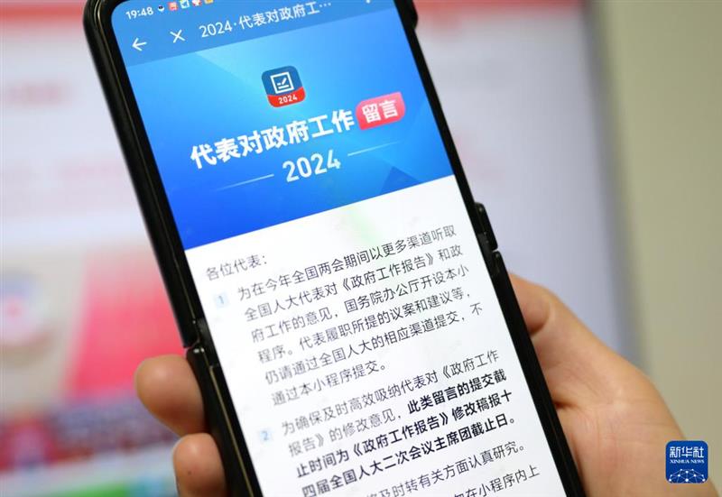 ??3月5日,工作人員向記者展示“2024·代表對政府工作留言”小程序。新華社記者 李賀 攝