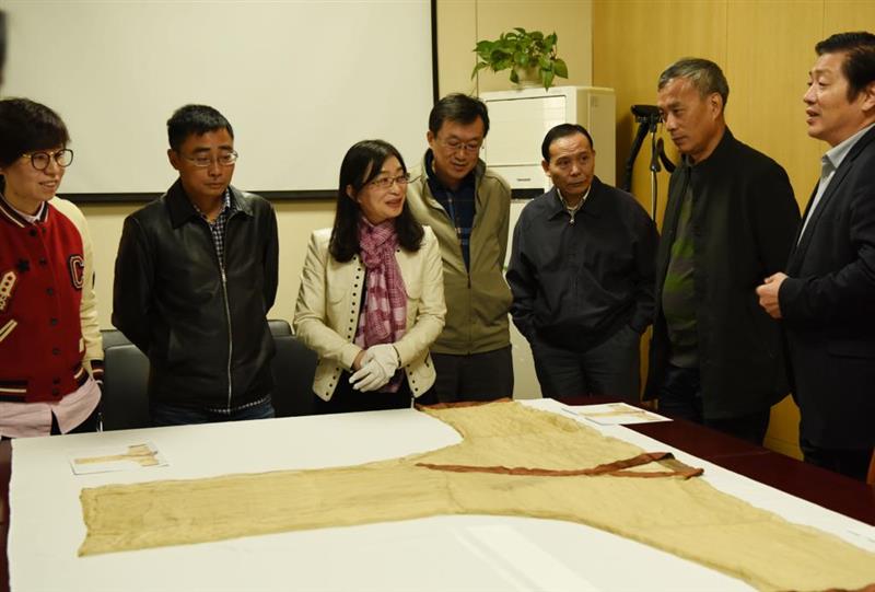 這是南京云錦研究所設(shè)計(jì)中心主任楊冀元(左一)和相關(guān)專家在仿制素紗單衣前召開論證會(huì)。南京云錦研究所供圖