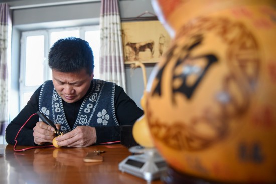 在新疆霍爾果斯市加爾蘇村,村民曹光耀在自己的工作室內創(chuàng)作葫蘆烙畫(2月6日攝)。新華社記者 丁磊 攝