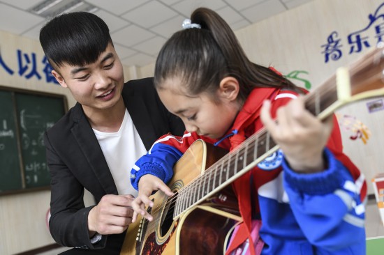 在新疆且末縣第二小學,支教老師史興林(左)在教學生祖麗阿婭彈吉他(2019年4月18日攝)。新華社記者 王菲 攝