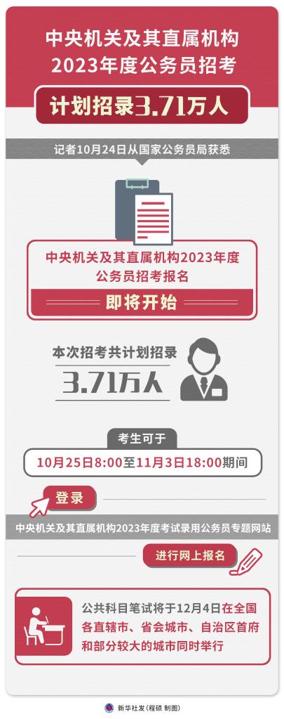 新華社北京10月24日電 記者24日從國(guó)家公務(wù)員局獲悉,中央機(jī)關(guān)及其直屬機(jī)構(gòu)2023年度公務(wù)員招考報(bào)名即將開(kāi)始。本次招考共計(jì)劃招錄3.71萬(wàn)人。