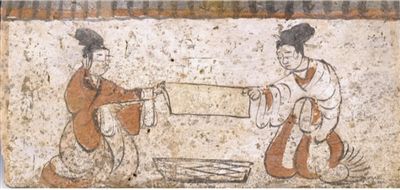 圖為甘肅高臺(tái)壁畫墓出土畫像磚“剪布圖”。 |