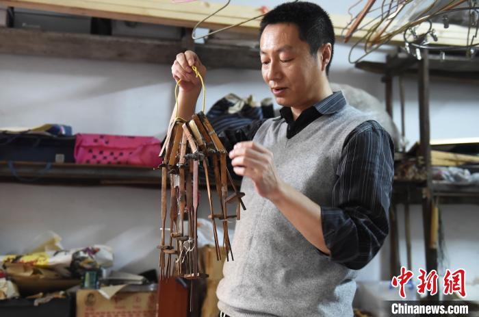 圖為李開軍展示制作榮昌折扇的部分工具。 周毅 攝