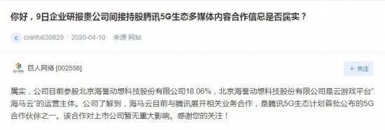 據(jù)媒體報(bào)道,相關(guān)A股上市公司中,巨人網(wǎng)絡(luò)間接持股騰訊5G生態(tài)多媒體內(nèi)容合作伙伴海馬云。此消息引發(fā)投資者廣泛關(guān)注并在互動易平臺提問,巨人網(wǎng)絡(luò)在互動易中回復(fù)了投資者的問題。