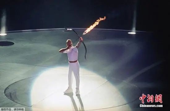資料圖:37歲的安·雷波略在離焰塔70米處用弓箭將火把射出,“射燃”了21米高塔上火炬臺,點燃奧運圣火。