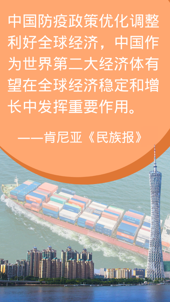 肯尼亞《民族報》報道認為,中國防疫政策優(yōu)化調(diào)整利好全球經(jīng)濟,中國作為世界第二大經(jīng)濟體有望在全球經(jīng)濟穩(wěn)定和增長中發(fā)揮重要作用。