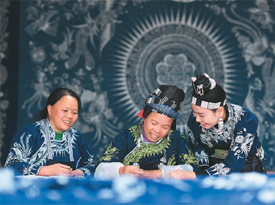 貴州省丹寨縣把非遺技藝與鄉(xiāng)村振興有效結(jié)合,設(shè)立非遺工坊,采取“非遺+文創(chuàng)”的方式設(shè)計(jì)、制作旅游文創(chuàng)產(chǎn)品,推動(dòng)苗族蠟染、銀飾鍛造、竹編鳥(niǎo)籠等非遺技藝的保護(hù)與傳承,并為掌握非遺技藝的村民在村中提供創(chuàng)作、創(chuàng)業(yè)平臺(tái),實(shí)現(xiàn)本地就業(yè)。圖為村民在該縣龍泉鎮(zhèn)卡拉村的苗族蠟染工坊內(nèi)畫蠟畫。 |