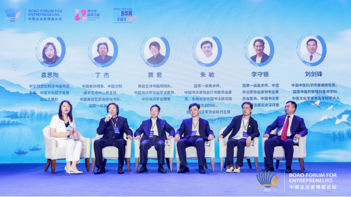 ??第二場(chǎng)圓桌對(duì)話以“中華優(yōu)秀傳統(tǒng)文化的創(chuàng)造性轉(zhuǎn)化與創(chuàng)新性發(fā)展”為題,由新華網(wǎng)文化頻道、書畫頻道主編,中國文化經(jīng)濟(jì)發(fā)展論壇總策劃袁思陶擔(dān)任主持。中國美協(xié)理事、中國文聯(lián)美術(shù)藝術(shù)中心原主任、中國美協(xié)藝委會(huì)原秘書長(zhǎng)、國家一級(jí)美術(shù)師丁杰在對(duì)話中表示,作為一名藝術(shù)家,在新時(shí)代要?jiǎng)?chuàng)造精品力作回報(bào)社會(huì)和人民。文化是源,文化是根,文化是我們的精神家園,我們要為精神家園添磚加瓦,做出自己的貢獻(xiàn)。黃庭堅(jiān)詩書畫院院長(zhǎng)、中國書法家協(xié)會(huì)學(xué)術(shù)委員、中華詩詞學(xué)會(huì)理事黃君認(rèn)為,書法家的創(chuàng)作要追求“三合一”,文字內(nèi)容、作品形式和心情境界——三者的完美統(tǒng)一,這將會(huì)推動(dòng)整個(gè)書法藝術(shù)與時(shí)代相結(jié)合,與歷史相溝通,與未來相同步。國家一級(jí)美術(shù)師、中國書法家協(xié)會(huì)行書委員會(huì)委員、東南大學(xué)中國書法研究院常務(wù)副院長(zhǎng)、南京市書法家協(xié)會(huì)執(zhí)行主席朱敏則呼吁提高全民族書法藝術(shù)的鑒賞水平,提高書法的文化支撐。中國中醫(yī)科學(xué)院首席研究員、國家中醫(yī)藥管理局重點(diǎn)學(xué)科-中醫(yī)文化學(xué)學(xué)術(shù)及學(xué)科帶頭人劉劍鋒表示中醫(yī)藥學(xué)是幾千年的智慧結(jié)晶,它是有文化內(nèi)涵的醫(yī)學(xué)。推動(dòng)中醫(yī)藥的傳承發(fā)展,維護(hù)人類健康是將來的大趨勢(shì)。國家一級(jí)美術(shù)師、中國書法家協(xié)會(huì)隸書專業(yè)委會(huì)委員李守銀則結(jié)合自身的經(jīng)歷,在對(duì)話中發(fā)表了觀點(diǎn)。