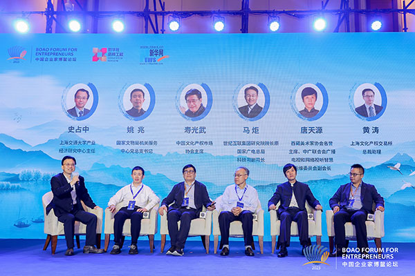 ??第三場(chǎng)圓桌對(duì)話主題為“數(shù)字經(jīng)濟(jì)時(shí)代文化產(chǎn)業(yè)發(fā)展的機(jī)遇與挑戰(zhàn)”,由上海交通大學(xué)產(chǎn)業(yè)經(jīng)濟(jì)研究中心主任史占中主持。國家文物局機(jī)關(guān)服務(wù)中心黨總支書記姚兆在對(duì)話中表示,由政府引導(dǎo)企業(yè)參與,科研機(jī)構(gòu)將科研成果持續(xù)介入,一定是文博行業(yè)產(chǎn)業(yè)發(fā)展最佳契合的方向。中國文化產(chǎn)權(quán)市場(chǎng)協(xié)會(huì)主席壽光武認(rèn)為,數(shù)字文化產(chǎn)業(yè)會(huì)在數(shù)據(jù)時(shí)代升級(jí)改造呈現(xiàn)繁榮和絢麗的色彩,同時(shí)文化產(chǎn)業(yè)又會(huì)融合加入新的產(chǎn)業(yè),它會(huì)成為整個(gè)中華民族生態(tài)文明生態(tài)重要的一環(huán),它的邊界和成長(zhǎng)會(huì)有更大的疆域。世紀(jì)互聯(lián)集團(tuán)研究院院長(zhǎng)、原國家廣電總局科技司副司長(zhǎng)馬炬從技術(shù)的角度分析了人工智能今年來產(chǎn)生爆炸性增長(zhǎng)和極高關(guān)注度的原因,呼吁要高度重視從AI到AIGC生產(chǎn)出來的文化產(chǎn)品。西藏美術(shù)家協(xié)會(huì)名譽(yù)主席、中廣聯(lián)合會(huì)廣播電視和網(wǎng)絡(luò)視聽智慧運(yùn)維委員會(huì)副會(huì)長(zhǎng)唐天源表示,廣大藝術(shù)家應(yīng)重新領(lǐng)略數(shù)字時(shí)代送給我們的饕餮盛宴,從精神上享受它,在數(shù)字時(shí)代打造出更多優(yōu)秀的文化產(chǎn)品。上海文化產(chǎn)權(quán)交易所總裁助理黃濤認(rèn)為,海量的文化資源和數(shù)字內(nèi)容的沉淀積累,提供著巨大的機(jī)會(huì),期待更多的從業(yè)者和創(chuàng)業(yè)者加入進(jìn)來,大家共同努力,繁榮好整個(gè)生態(tài)的發(fā)展。