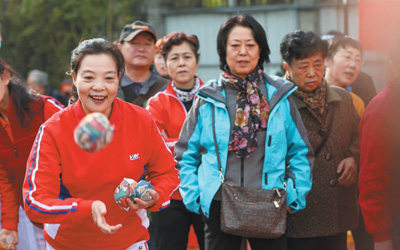 ??湖北省襄陽市老年大學(xué)運(yùn)動會上,運(yùn)動員在進(jìn)行投沙包比賽。楊 東攝(影像中國)