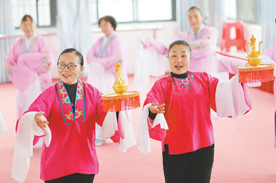 ??湖南省永州市道縣,老年大學(xué)學(xué)員們正在表演京劇《麻姑獻(xiàn)壽》。何紅福攝(影像中國)