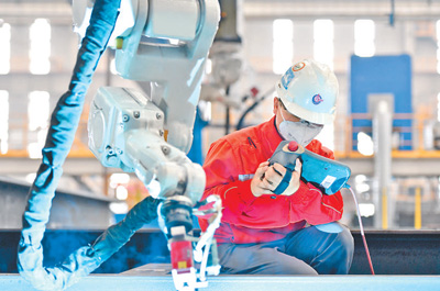 在我國首個海洋油氣生產(chǎn)裝備智能制造基地——海洋石油工程股份有限公司天津智能化制造基地,工作人員在操作焊接機(jī)器人。該基地重點(diǎn)發(fā)展油氣生產(chǎn)平臺及上部模塊等海洋工程產(chǎn)品。