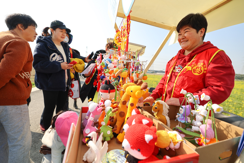 在駱駝街道敬德村黃沙閘千畝油菜花田,整個(gè)現(xiàn)場(chǎng)布滿“露營(yíng)風(fēng)”元素,主舞臺(tái)區(qū)露營(yíng)天幕供觀眾游人休憩;花海創(chuàng)意市集上“荒野咖啡”、“共富工坊”農(nóng)產(chǎn)品展銷、國(guó)潮文藝展示、公益社團(tuán)義賣等攤位一字排開;自然課堂區(qū)以“兒童友好”理念專門為小朋友們?cè)O(shè)置花田研學(xué)小課程,孩子們?cè)诨ㄌ锢矬w驗(yàn)非遺手作——植物拓印布袋。