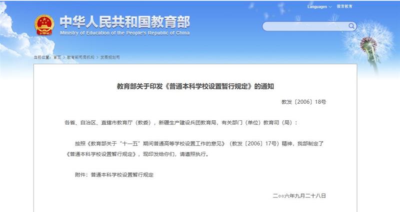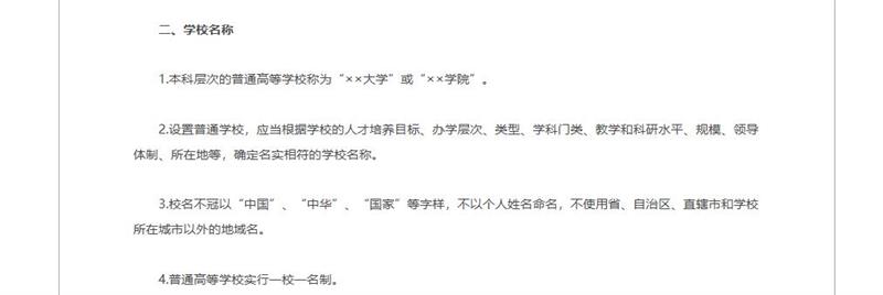 而按照《教育部關(guān)于“十一五”期間普通高等學(xué)校設(shè)置工作的意見》(教發(fā)〔2006〕17號(hào))精神,教育部2006年制定印發(fā)了《普通本科學(xué)校設(shè)置暫行規(guī)定》, 其中第二大點(diǎn)關(guān)于“學(xué)校名稱”的第3條規(guī)定:校名不冠以“中國(guó)”“中華”“國(guó)家”等字樣,不以個(gè)人姓名命名,不使用省、自治區(qū)、直轄市和學(xué)校所在城市以外的地域名。