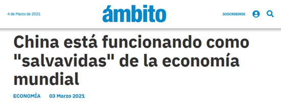 阿根廷《金融界報(bào)》3月3日發(fā)表題為《中國在世界經(jīng)濟(jì)中扮演“救生圈”的角色》文章。文中說,中國是世界上大多數(shù)國家的主要經(jīng)濟(jì)合作伙伴,因此中國經(jīng)濟(jì)的快速恢復(fù)對(duì)全球經(jīng)濟(jì)有著至關(guān)重要的作用。(網(wǎng)站截圖)
