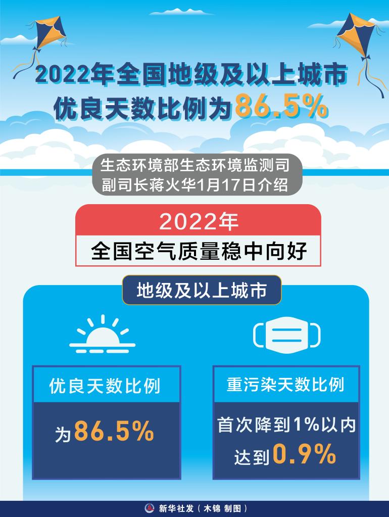新華社北京1月17日電(記者 高敬)生態(tài)環(huán)境部生態(tài)環(huán)境監(jiān)測司副司長蔣火華17日介紹,2022年,全國空氣質(zhì)量穩(wěn)中向好,地級及以上城市優(yōu)良天數(shù)比例為86.5%;重污染天數(shù)比例首次降到1%以內(nèi),達(dá)到0.9%。