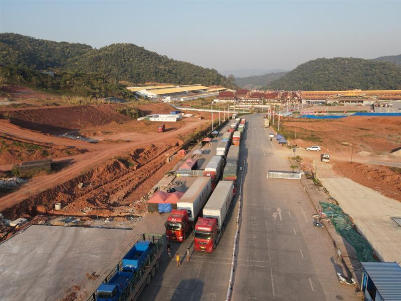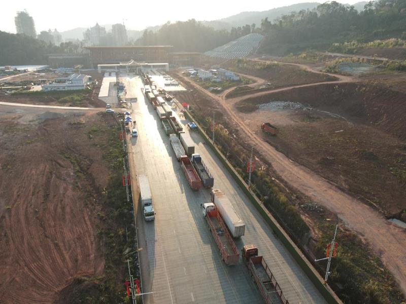 磨憨-磨丁經(jīng)濟(jì)合作區(qū)一角,貨車排隊(duì)等著出關(guān)。新華社記者 浦超 攝