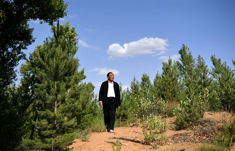 石光銀在自己最早治理的“狼窩沙”林地里(2020年5月30日攝)。新華社記者 劉瀟 攝