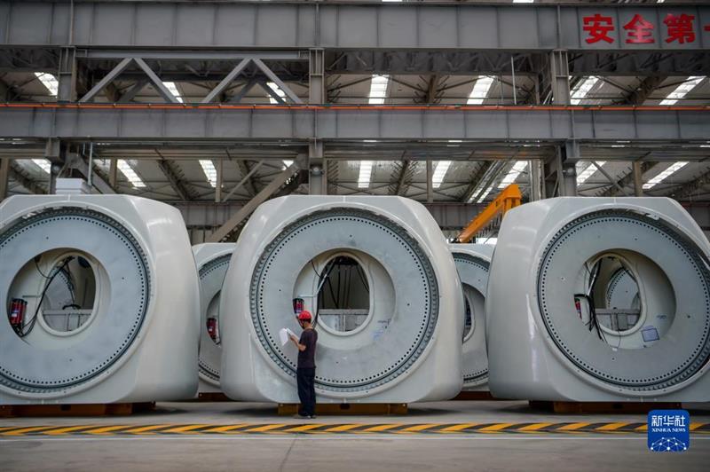 2022年8月2日,工人在內(nèi)蒙古烏蘭察布市運(yùn)達(dá)風(fēng)電有限公司廠房里檢查產(chǎn)品質(zhì)量。新華社記者 李志鵬 攝