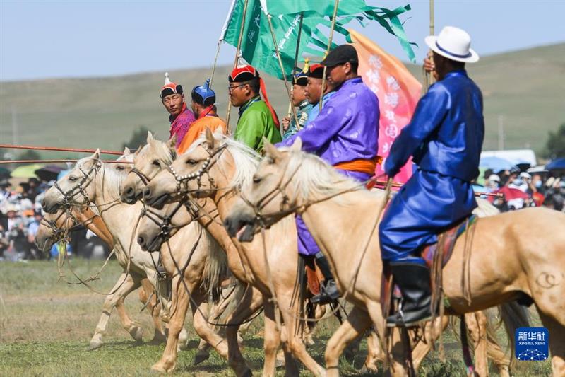 2022年7月29日在內(nèi)蒙古自治區(qū)旅游那達(dá)慕開幕式上拍攝的馬隊(duì)。新華社記者 王澤聰 攝