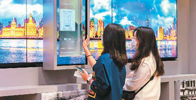 市民在上海圖書館東館體驗“影話外灘”多媒體裝置。王 初攝(人民圖片)