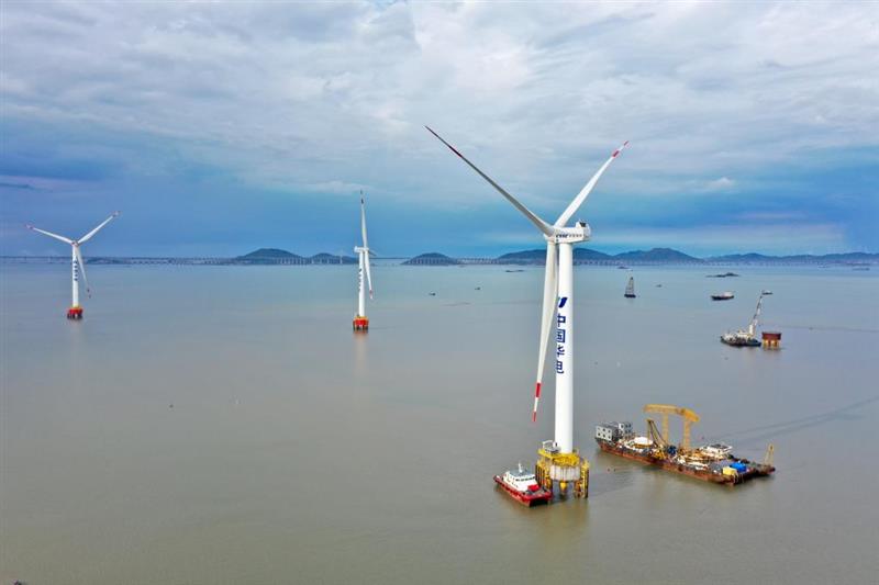 這是華電福清海壇海峽海上風(fēng)電項(xiàng)目首臺海上風(fēng)電主控系統(tǒng)國產(chǎn)化機(jī)組(右)(2021年5月28日攝,無人機(jī)照片)。新華社記者 姜克紅 攝