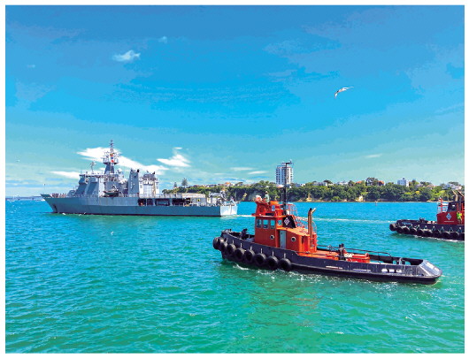 ▲1月18日,新西蘭海軍惠靈頓號(hào)艦(左)從位于奧克蘭的德文波特軍港啟航前往湯加。新西蘭國防部18日說,新西蘭海軍兩艘救援艦已于當(dāng)天出發(fā)前往湯加,準(zhǔn)備向湯加提供以淡水為主的救援物資。新華社發(fā)(新西蘭國防部供圖)