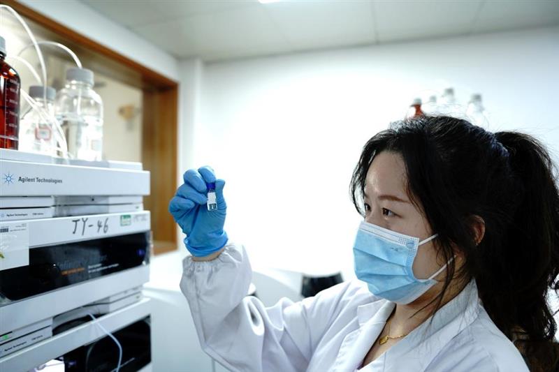 5月1日,在上海虹橋中藥飲片有限公司質(zhì)量檢測中心,檢測人員對產(chǎn)品進(jìn)行檢測。新華社記者 張建松 攝