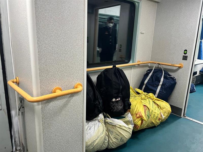 孫爺爺夫妻的部分行李,里面是他們準(zhǔn)備的香腸、雞、鴨、鵝等年貨。新華社記者 屈彥 攝