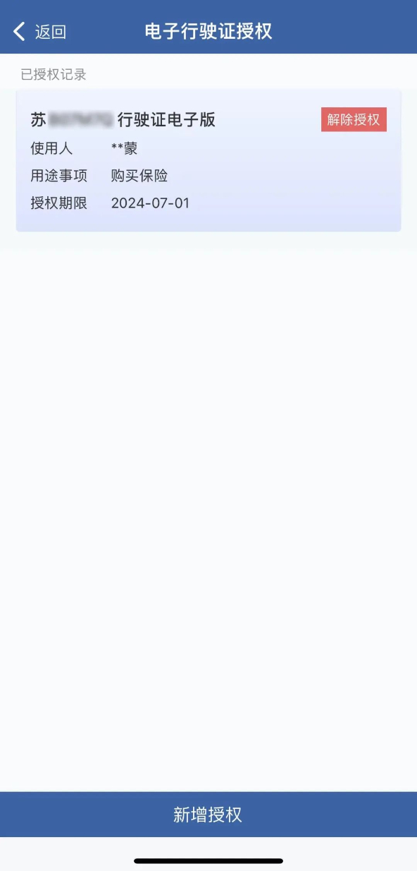 ??授權有效期最長為7個工作日。機動車所有人或單位法人、車輛管理人員可在授權列表中點擊【解除授權】按鈕中途解除授權,解除授權或授權到期后電子行駛證自動作廢,被授權人“交管12123”APP不再顯示。