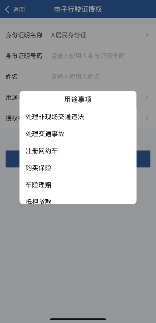 ??點擊電子行駛證下方【授權】按鈕進入授權列表,點擊頁面下方【新增授權】,填寫被授權人身份證號、姓名和授權有效期,選擇用途事項,提交授權。提交后被授權人電子證件列表中將增加授權電子行駛證列表項,用戶可點擊顯示授權出示的電子行駛證。