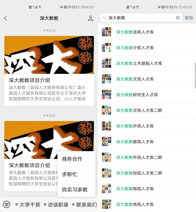 深大教教作為深圳大學(xué)校園的影響力自媒體平臺(tái),校園內(nèi)部鋪成了各個(gè)學(xué)院各個(gè)系每個(gè)學(xué)專業(yè)的垂直點(diǎn)到點(diǎn)的網(wǎng)絡(luò)結(jié)構(gòu),平臺(tái)覆蓋面積廣,基于本身產(chǎn)生于深圳大學(xué),所有也有許多外面企業(yè)不具備的深圳大學(xué)人才資源,能追蹤定位到每一個(gè)學(xué)子,目前覆蓋了全校35000+名校園學(xué)子。