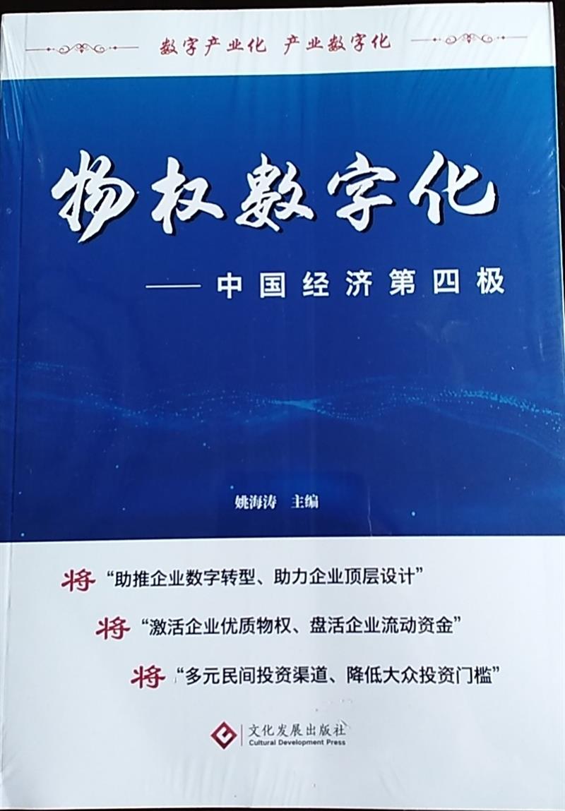 《物權(quán)數(shù)字化—中國經(jīng)濟(jì)第四極》由文化發(fā)展出版社出版,全國新華書店發(fā)行,由中國證券教父管金生作序、物權(quán)數(shù)字化概念創(chuàng)始人姚海濤先生主編、工業(yè)與信息化部華盛綠色工業(yè)基金會(huì)副秘書長鄭占淮博士等聯(lián)合撰寫。這是中國第一部關(guān)于“物權(quán)數(shù)字化”的論述專著,該書首次提出“物權(quán)數(shù)字化”新概念、新業(yè)態(tài)、新動(dòng)能學(xué)說理論,專著對(duì)激活數(shù)以萬億計(jì)物權(quán)資產(chǎn)的流動(dòng)性,將具有劃時(shí)代的非凡意義。