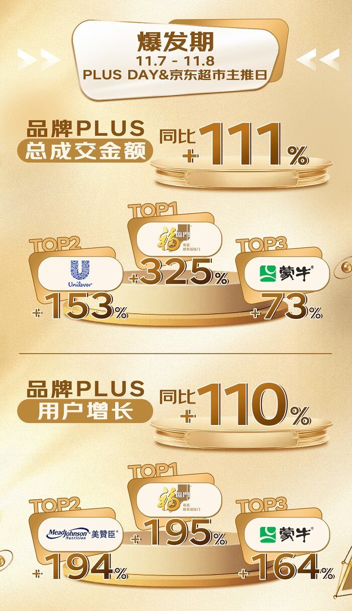 雙十一期間,京東PLUSDAY與京東超市同頻爆發(fā),從品牌權(quán)益投入、專屬心智貨品及平臺資源加持三方面入手,實現(xiàn)品牌PLUS用戶及成交額雙增長。據(jù)戰(zhàn)報顯示,品牌PLUS總成交金額同比增長111%,品牌PLUS用戶同比增長110%。其中特侖蘇爆品訂單量同比增長1113%,安達(dá)露西產(chǎn)品訂單量同比增長394%,科羅娜產(chǎn)品訂單量同比增長325%。