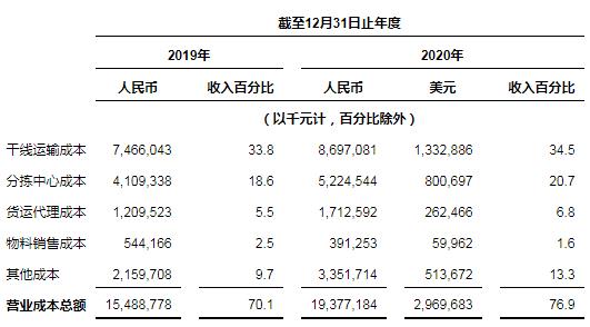 收入總額為人民幣25,214.3百萬(wàn)元(3,864.3百萬(wàn)美元),較去年的人民幣22,109.9百萬(wàn)元增長(zhǎng)14.0%。核心快遞服務(wù)收入增長(zhǎng)11.9%,該增長(zhǎng)是由于包裹量同比增長(zhǎng)40.3%以及單票價(jià)格下降20.2%的綜合影響所致。貨運(yùn)代理服務(wù)于2020年的全年收入為人民幣1,862.7百萬(wàn)元(285.5百萬(wàn)美元),而2019年為人民幣1,236.0百萬(wàn)元。物料銷(xiāo)售收入主要由列印電子面單所需的熱敏紙銷(xiāo)售收入組成,同比增長(zhǎng)僅4.0%,這是由于自2020年低價(jià)格的一聯(lián)電子面單使用率增加。其他收入主要由金融貸款業(yè)務(wù)和廣告服務(wù)組成。