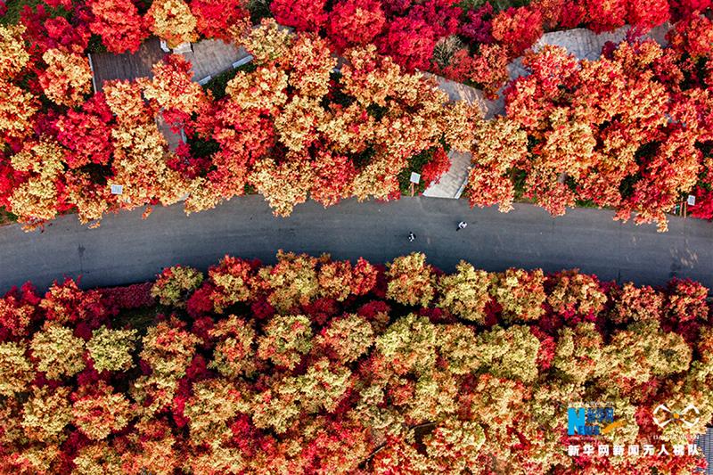 俯瞰植物園內,漫山遍野的紅楓呈現一派紅黃相間的海洋,像打翻的調色盤。新華網發(fā)(秦蒸 攝)
