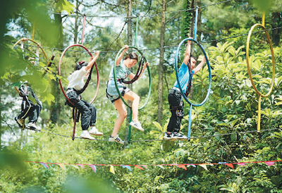游客在貴州省黔東南苗族侗族自治州岑鞏縣木召生態(tài)休閑度假區(qū)體驗(yàn)叢林穿越旅游項(xiàng)目。