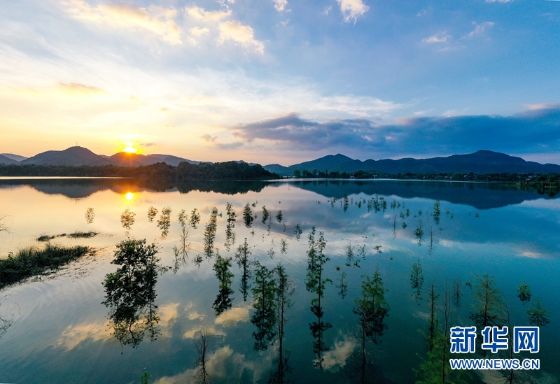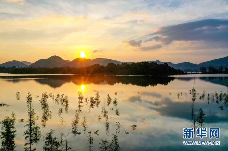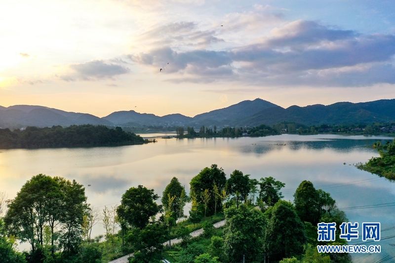 經(jīng)水環(huán)境治理,進入豐水期的四川省華鎣山天池湖,在夕陽和彩云的映襯下,呈現(xiàn)出云落天池若鏡天的美景。新華網(wǎng)發(fā)(邱海鷹、劉南賢 攝)