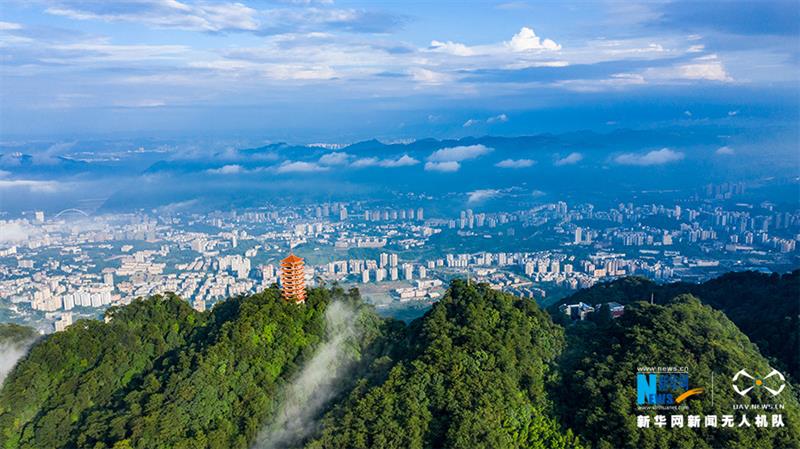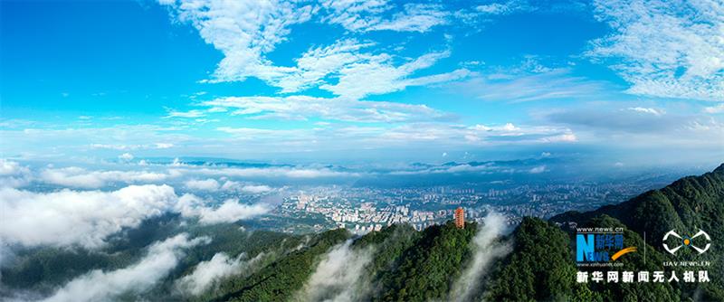 一場(chǎng)雨后,重慶市北碚區(qū)縉云山迎來(lái)絕佳景致。藍(lán)天白云之下,青山屹立,云霧繚繞,宛如一幅壯闊畫(huà)卷。新華網(wǎng)發(fā)(秦廷富 攝)