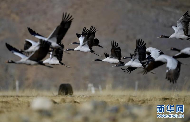 冬日,大批黑頸鶴在西藏拉薩市林周縣境內(nèi)棲息、覓食。 林周縣黑頸鶴自然保護區(qū)建立于1993年,2003年被設立為國家級自然保護區(qū),是雅魯藏布江中游自然保護區(qū)的核心部分,在每年的11月底至12月初,這里便會迎來成群的黑頸鶴過冬。