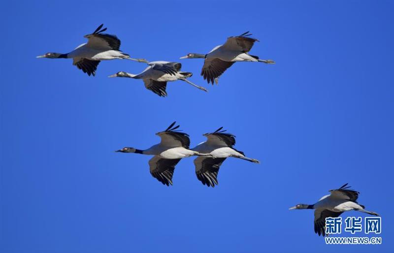 黑頸鶴在自然保護區(qū)上空飛翔(2021年1月3日攝)。