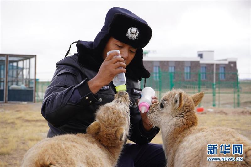 12月7日,可可西里索南達杰保護站站長趙新錄在給藏羚羊幼仔喂奶。