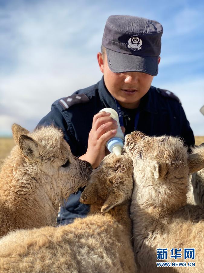可可西里巡山隊員鄧海平給藏羚羊幼仔喂奶(12月6日攝)。