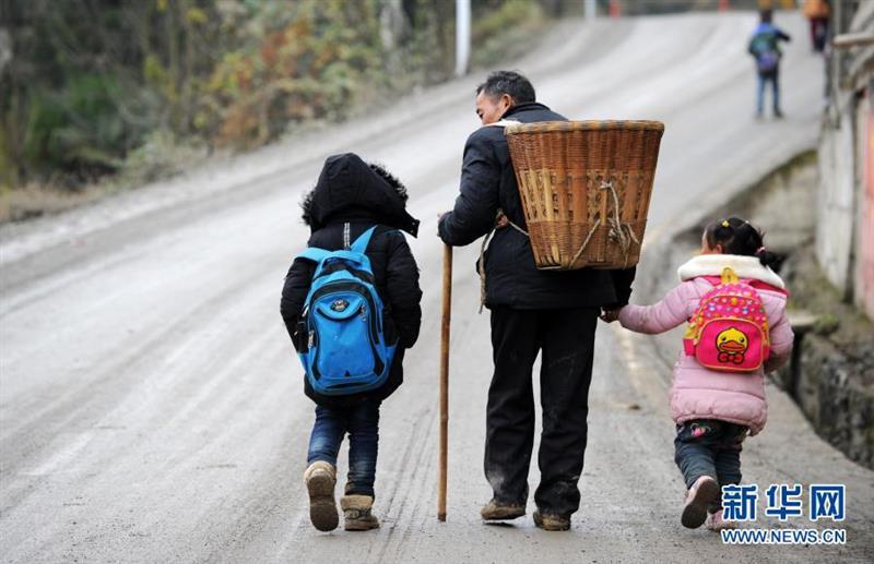 李思宇、李青怡的父母因常年在外務(wù)工,每天接送孩子上下學(xué)的重任就落在爺爺李昌德肩上。從家到鄉(xiāng)里學(xué)校的距離大約4公里,老人帶著孩子,爬坡下嶺,需要步行近1個小時。