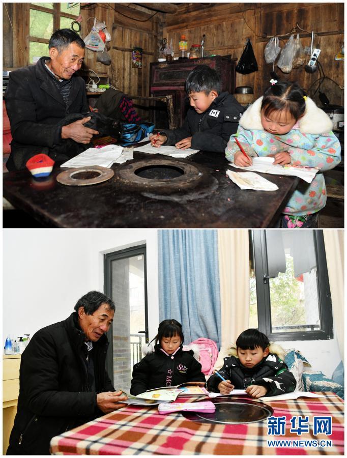 拼版照片:上圖為2018年12月13日,在貴州省大方縣三元鄉(xiāng)河頭村的老屋內(nèi),李昌德(左一)在看著李思宇(中)、李青怡做作業(yè);下圖為2020年12月23日,在大方縣奢香古鎮(zhèn)易地扶貧搬遷安置點的新家,李昌德(左一)在輔導(dǎo)李青怡(中)、李思宇做家庭作業(yè)。新華社記者 楊文斌 攝