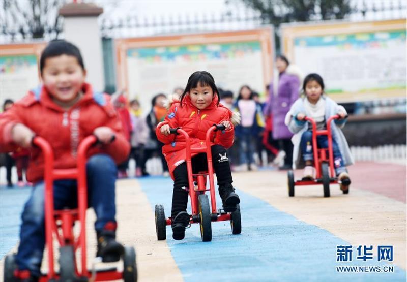 12月24日,李青怡(中)在大方縣恒大第十二幼兒園里與小朋友們比賽騎車。新華社記者 楊文斌 攝