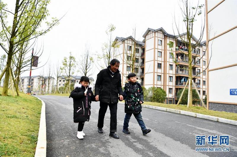 12月23日,在大方縣奢香古鎮(zhèn)易地扶貧搬遷安置點,李昌德(中)牽著李思宇(右)、李青怡放學(xué)歸來。新華社記者 楊文斌 攝