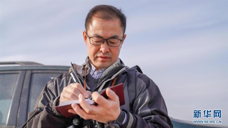 3月30日,在白城市鎮(zhèn)賚縣,護飛隊長潘晟昱用筆記本記錄候鳥信息。新華社記者 顏麟蘊 攝